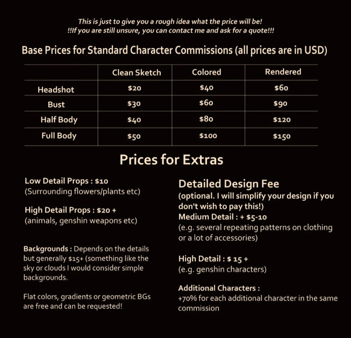Commission prices are subject to the details of your commission but I've included base prices so that you can estimate! If you are unsure feel free to enquire an estimation/quote from me before requesting! (via email [email protected] or insta @its.kensho)If you have a budget in mind already, please let me know. That way it is easier for me to discuss the details while staying in budget for you!